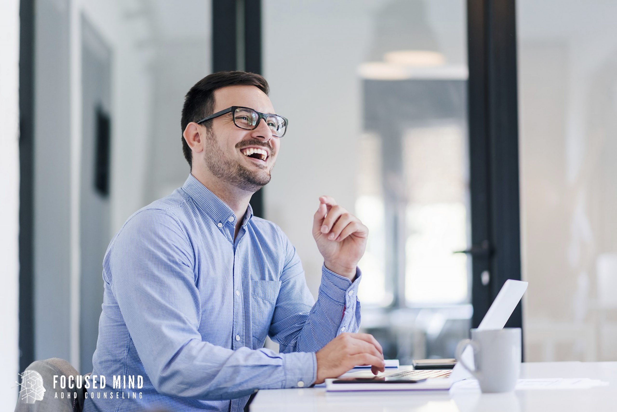 Wouldn’t I have outgrown it by now if I have ADHD?A man smiles in his office as he types something on their laptop. Focused Mind ADHD Counseling can offer support with ADHD testing in Columbus, OH. Learn more by contacting an adult ADHD specialist in Ohio today. 43220 | 43016 | 43017