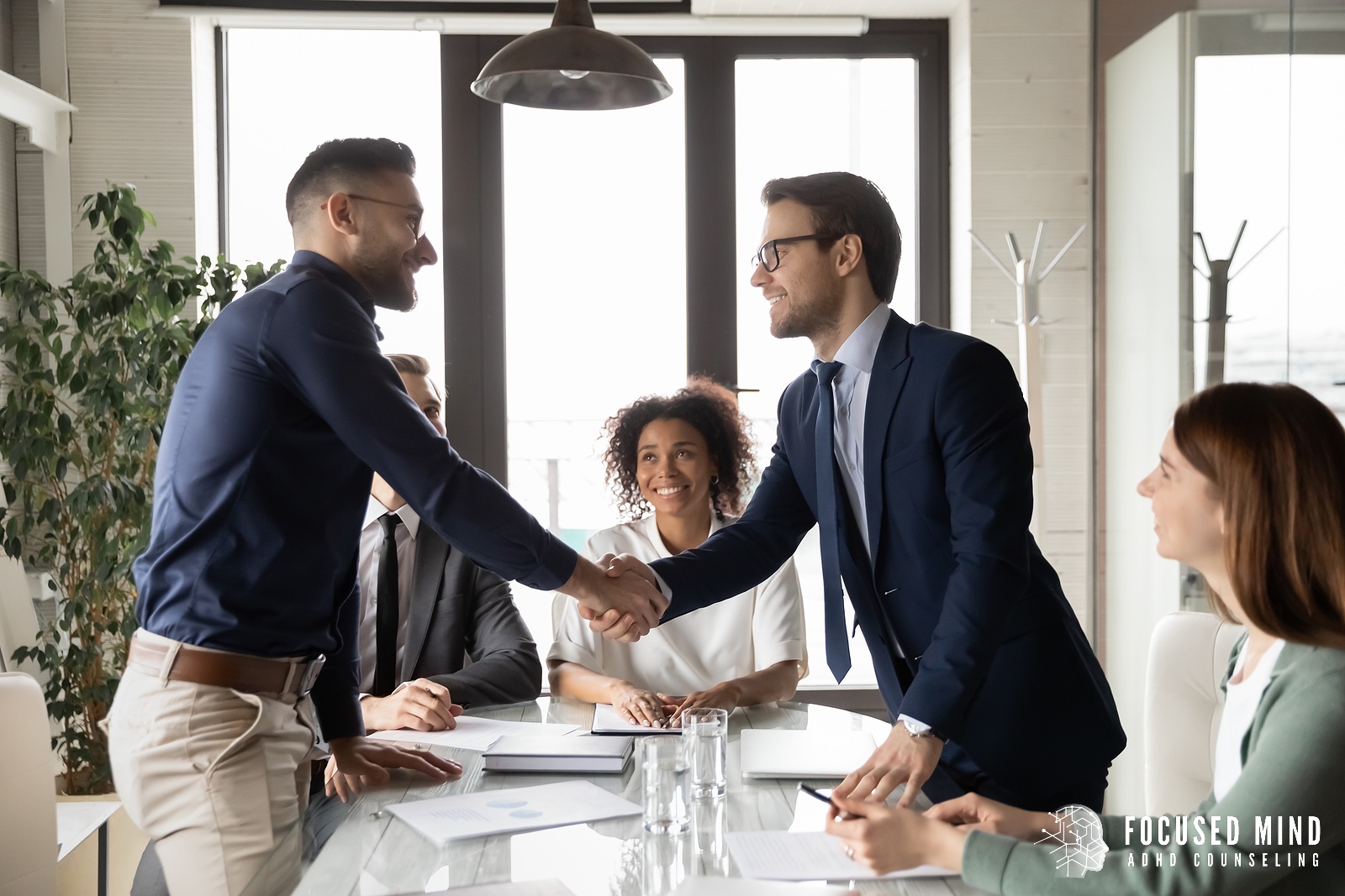 Two professionally dressed men shake hands in a modern office setting with large windows. A group of colleagues sits at the table, smiling and engaged in the discussion. Learn how working with an adult ADHD therapist in Columbus, OH can offer support with emotional regulation therapy in Columbus, OH. Search for ADHD and emotional regulation Columbus, OH to learn more. Fear of conflict also tends to trigger avoidance. If a person with ADHD fears rejection or criticism, well, they likely aren’t asking for a promotion.