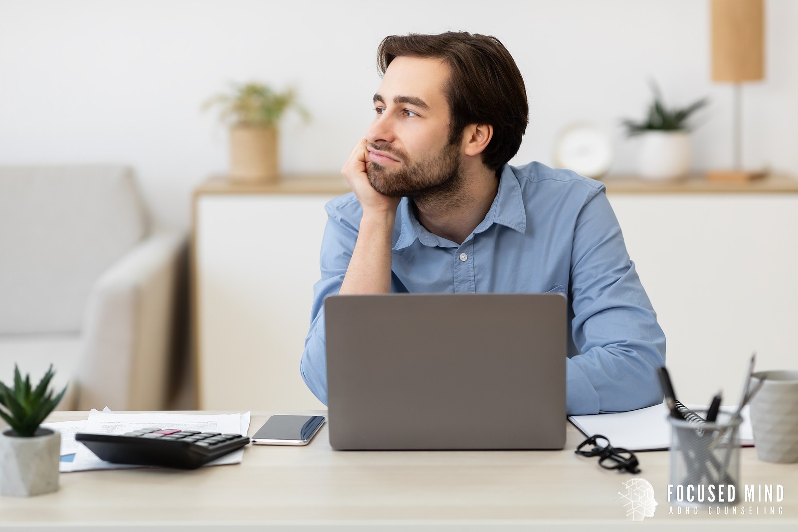 Stop over-committing.A man smiles as he daydreams in front of his open laptop. This could represent how ADHD in adults can effect time management skills. Contact Focused Mind ADHD Counseling for support with ADHD symptoms, or speak to an adult ADHD therapist in Ohio.