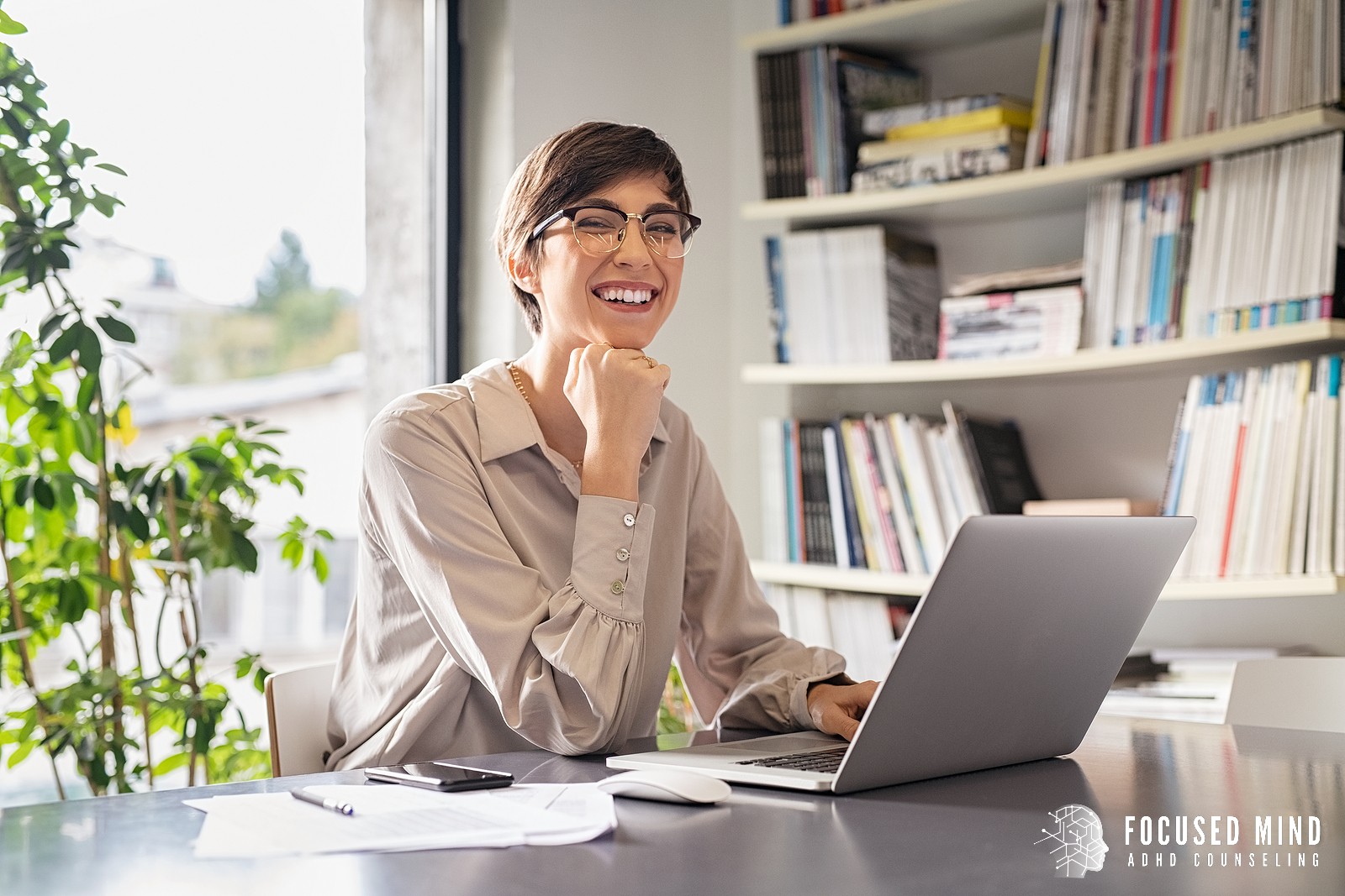 A woman in her office smiles at the camera as she types on a laptop. Learn about ADHD in adults through ADHD therapy in Columbus, OH. Contact Focused Mind ADHD Counseling for support from an adhd therapist today!Optimize your work environment.