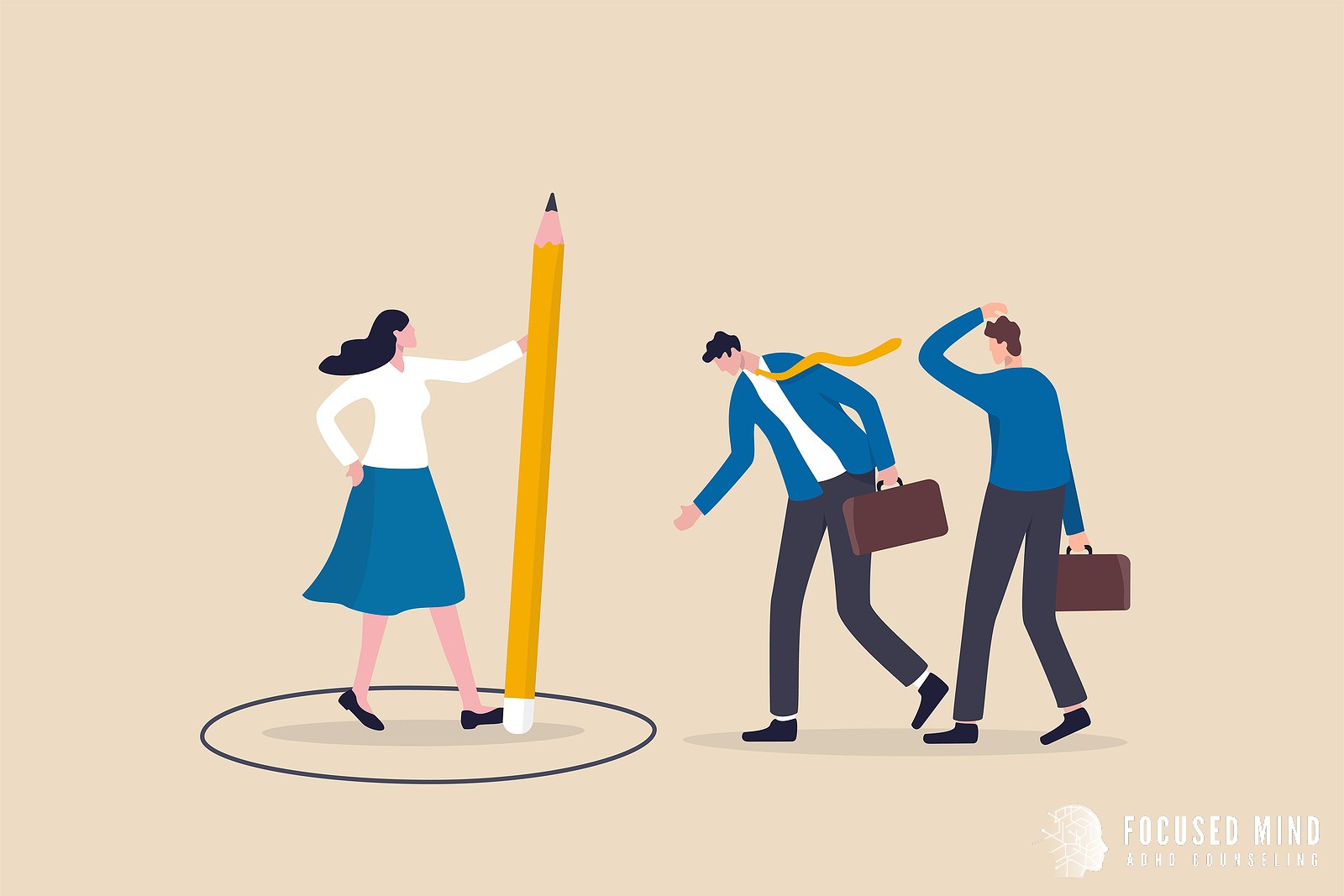 Guilt over past mistakes.A graphic of a woman creating a boundary around her with a large pencil. Focused Mind ADHD Counseling can offer support for ADHD and boundaries in Columbus, OH. Contact an ADHD therapist for adults near me or search "adhd symptoms ohio" to learn more.