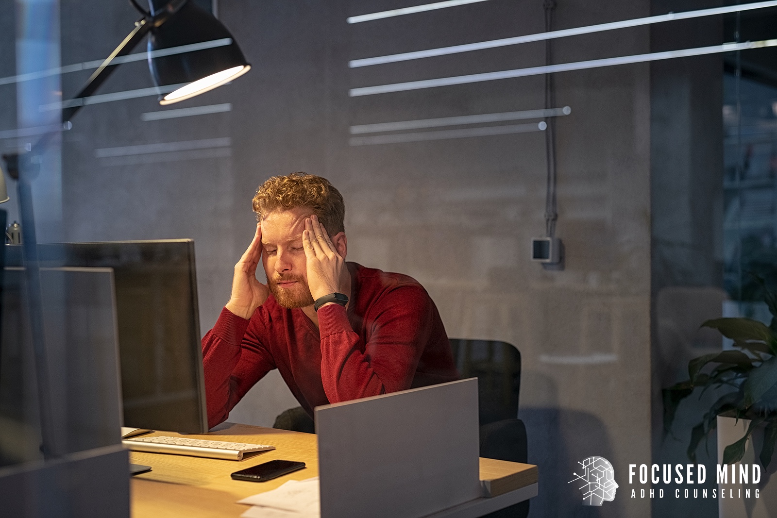 Overwhelmed employee in a meeting, showing how adhd symptoms ohio can lead to overcommitment and stress. Support from an adhd therapist in columbus, oh and an adhd evaluation in columbus, oh can help.