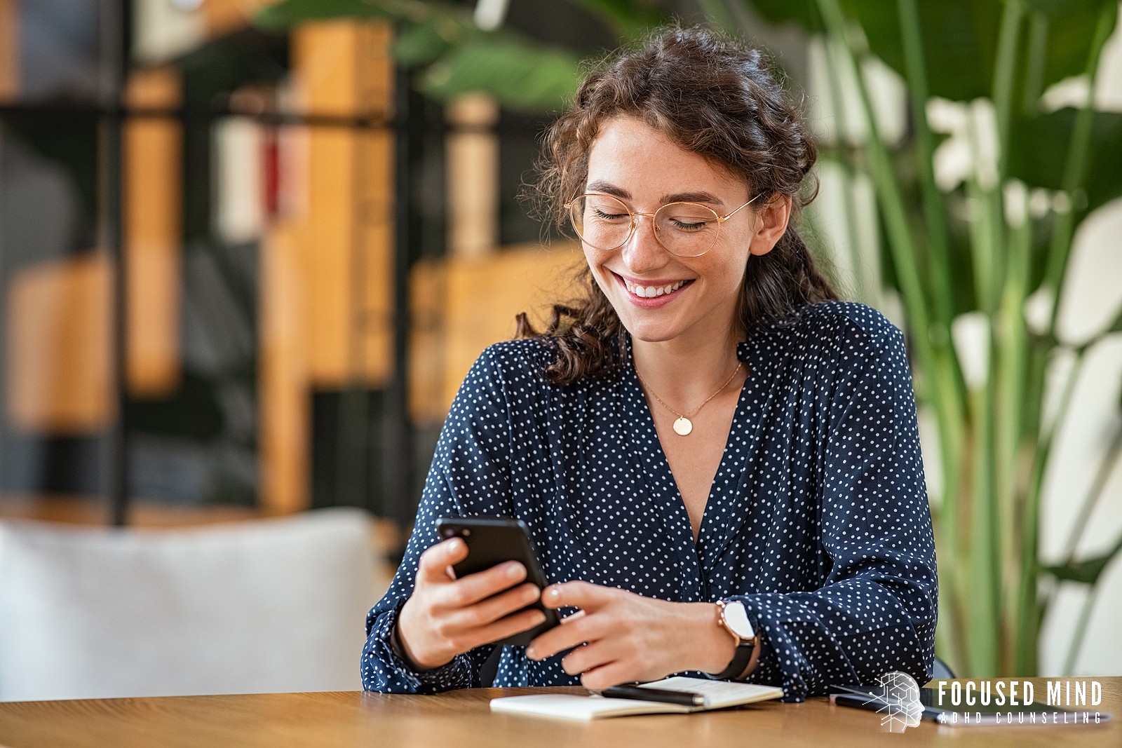 A woman smiles while looking at her phone. This could represent finding the right therapist in Columbus Ohio. Learn more about online therapy in Columbus, Ohio by searching "ADHD therapist for adults near me" today. Focused Mind ADHD Counseling would be happy to support you!Symptoms of Social Anxiety