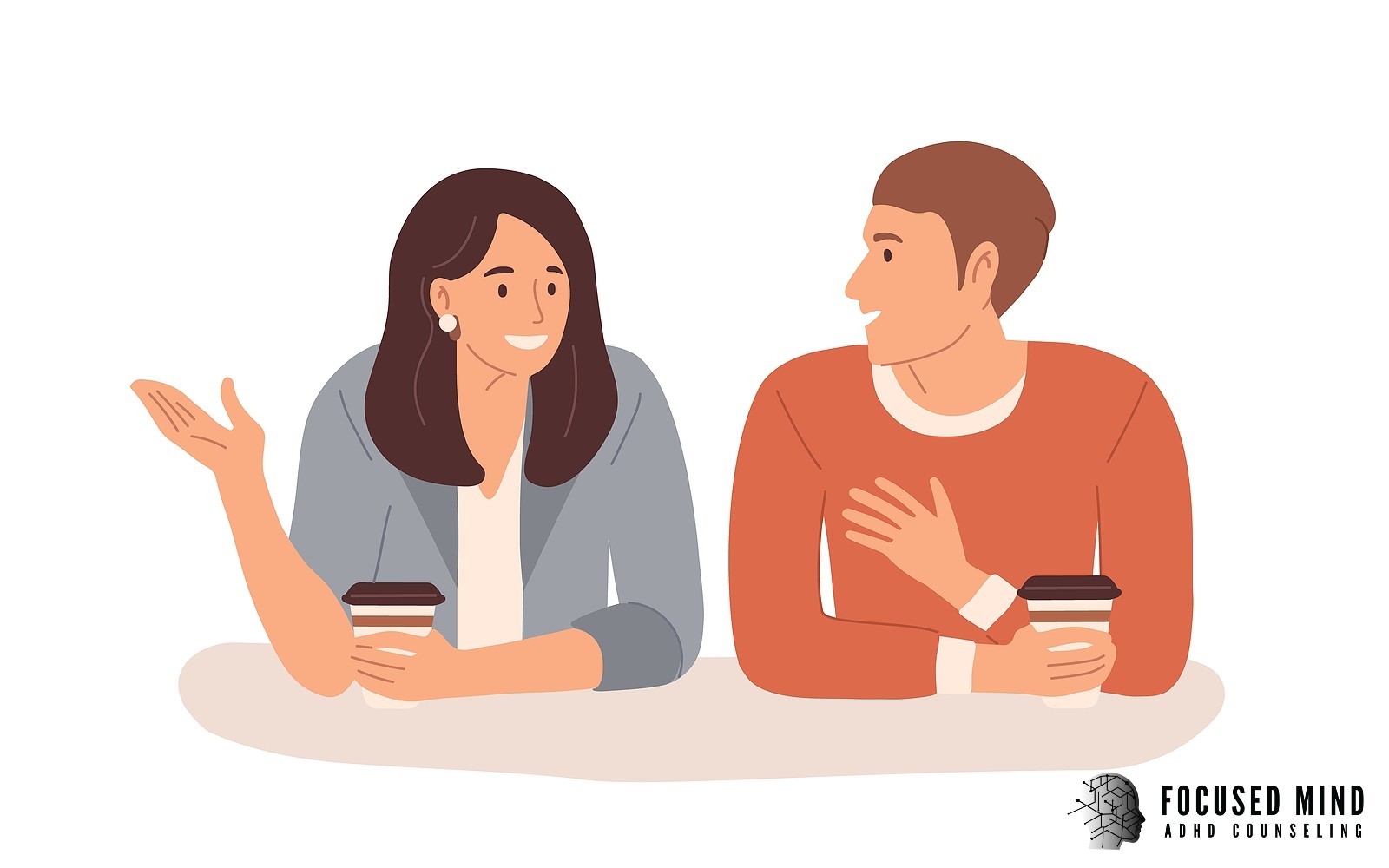 An illustration of two friends talking with one another. This could represent the support online therapy in Columbus, OH can offer. We offer support for ADHD in women in Columbus, OH and other services. Search