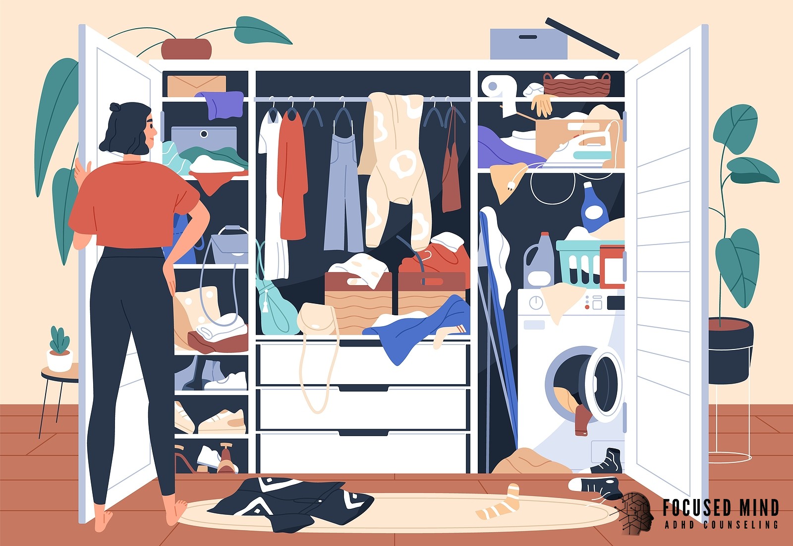 An illustration of a woman looking at the messy closet. This could represent the mental clutter ADHD in woman in Columbus, OH can address. Learn more about therapy for creatives Columbus, OH and other services including online therapy in Columbus, OH.Growing Up Female….with Undiagnosed ADHD