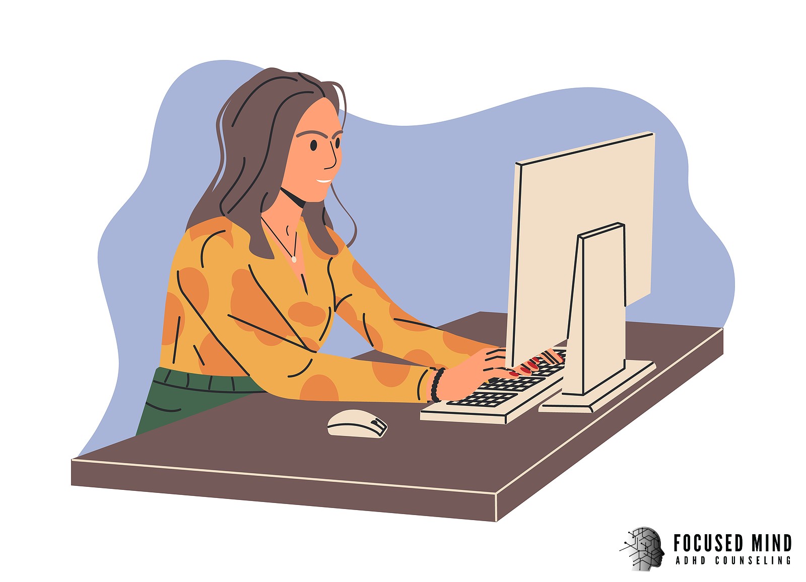 Toxic ShameAn illustration of a woman typing at a computer desk for Focused Mind ADHD Counseling. We offer online therapy in Columbus, OH and offer support for ADHD in women in Columbus, OH. Search "ADHD therapist for adults near me " to learn more.