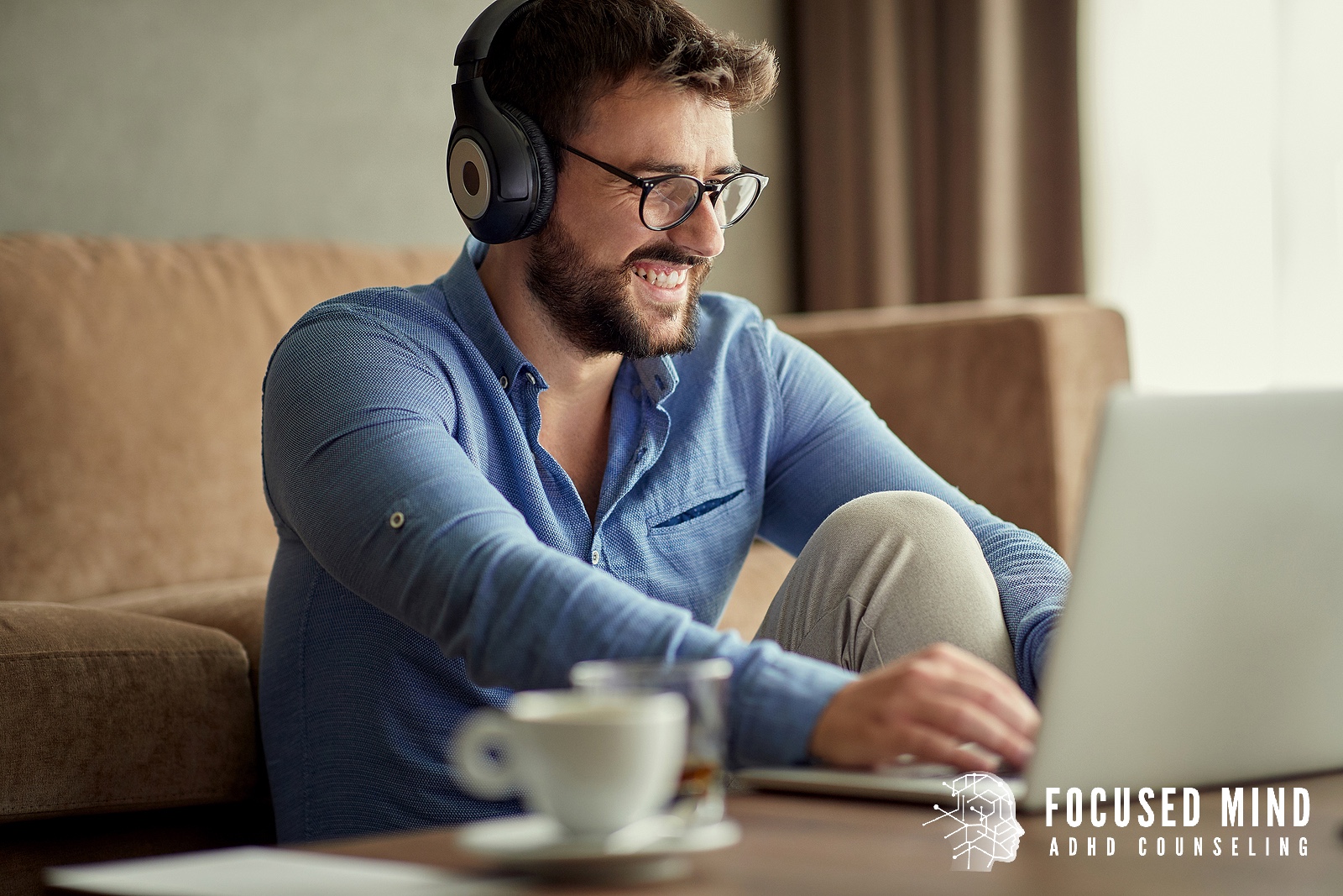 ADHD-informed Therapy for AnxietyMan working on a laptop with headphones, using online adhd treatment in columbus, oh to stay on track while navigating adhd and anxiety in adults columbus, oh. Anxiety therapy in columbus, oh can also help reduce overwhelm and restlessness.