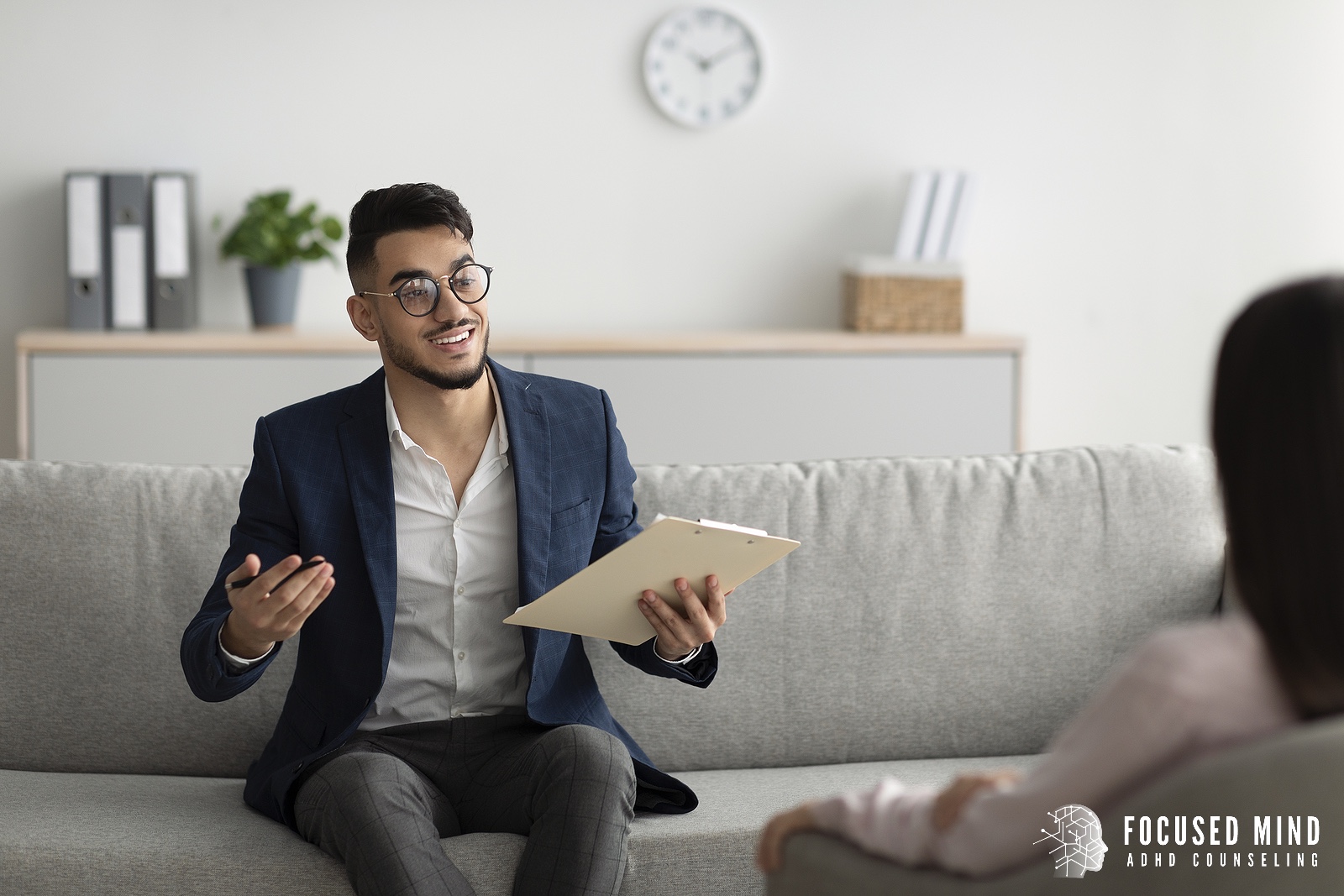 It’s Normal to Feel OverwhelmedA man and woman sit on a couch while talking. The woman holds a clipboard while listening to the man. Learn how adult ADHD testing in Columbus, OH can offer support by contacting a therapist in Columbus Ohio today. Search for an adult ADHD therapist in Ohio to learn more.
