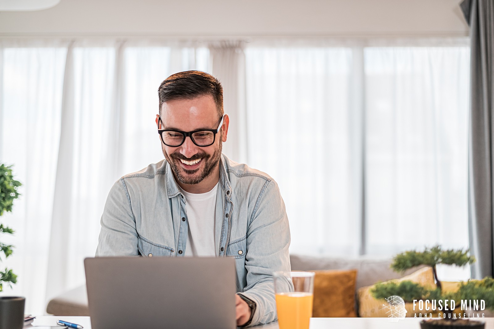 A man smiles as he types on a laptop with orange juice nearby. An adult ADHD therapist in Ohio at Focused Mind ADHD Counseling can offer support with working from home with ADHD in Columbus, OH. Contact a therapist in Columbus Ohio to learn more! On the other hand, many adults seen for ADHD testing express that on some level they’ve always known they have a unique mind. Working from home with ADHD only triggered the realization. And once they read about ADHD in adults, many events from childhood began to